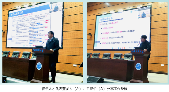 海洋学院董友扣,自动化学院王亚午作为特任岗位考核优秀的人才代表做分享交流。两位老师结合自身教学、科研、人才培养、社会服务等方面等工作经历分享了来校后的成长历程。