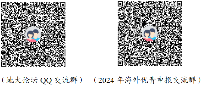 1.如有意了解学校人才引进政策,请实名加入第10届国际青年学者地大论坛QQ交流群(群号为:617211524)。如意向依托学校申报2024年海外优青,请实名加入QQ交流群(群号为:686334389)。