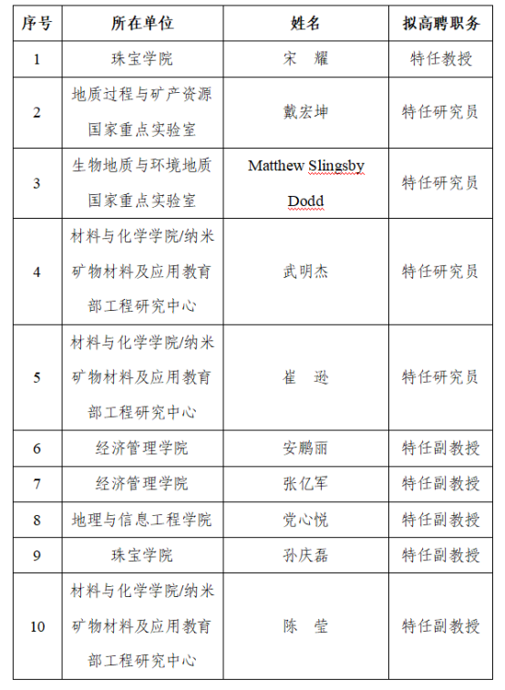 根据中国地质大学(武汉)《岗位设置管理实施方案(2019年修订版)》《特任教授(研究员)、特任副教授(副研究员)岗位管理办法(2019年修订版)》等文件规定,经个人申请、教学科研单位评议推荐、学校组织专家评审,宋耀等10人拟聘任至特任岗位。现将评审结果公示如下(排名不分先后)。