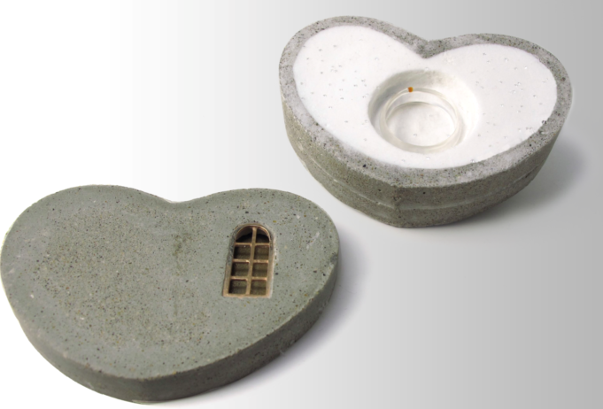 任开作品,《因为爱情》,胸针,11x8x4,水泥,银,宝石,收藏于瑞士国家博物馆(2011年)